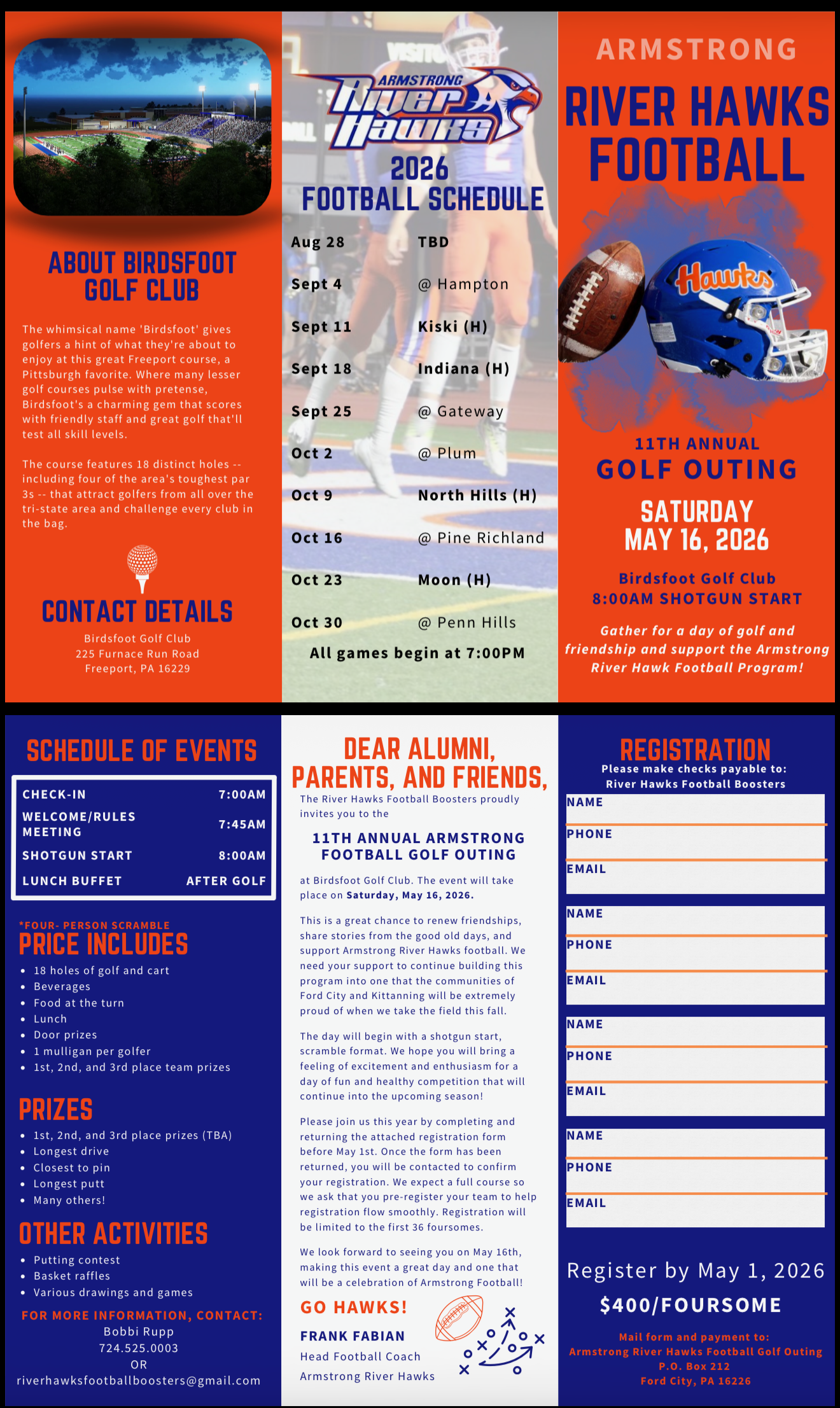 To Become a Sponsorof the Armstrong River Hawks Football Team and this event: If you are a business and would like to become a sponsor, please access the link for details or you can contact riverhawksfootballboosters@gmail.com or reach out to Bobbi Rupp at 724-525-0003 and we will work with you to enroll!